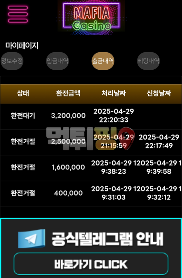 먹튀핑이 확인한 마피아카지노의 주요 먹튀 수법을 분석하여 공유드리니, 추가 피해를 방지하기 위해 즉시 이용을 중단하시고, 먹튀검증이 완료된 신뢰할 수 있는 안전한 사이트를 이용하시길 권장합니다.