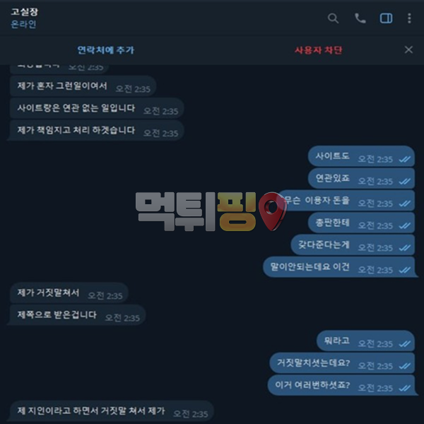 피해자는 총판과 직접 연락조차 해본 적 없는 상태였으며, 어떠한 위임이나 동의도 없었음. 그러나 운영자는 "총판과 해결하라"며 책임을 전가하고, 정작 총판은 “급해서 대신 환전받았다”고 변명만 반복함.